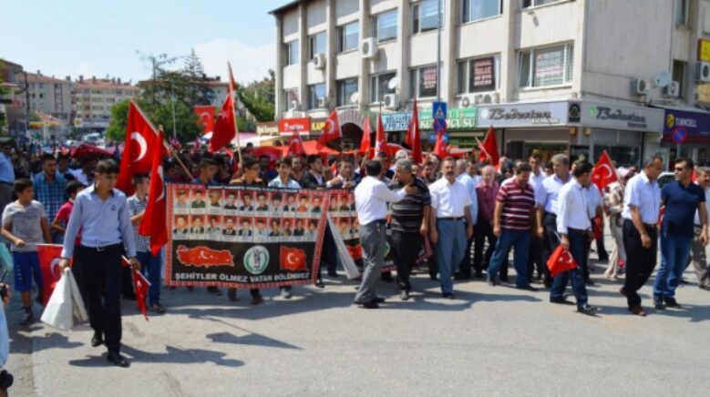 Konuşmaların ardından, yürüyüşe geçilen protesto gösterisinde“şehitler ölmez vatan bölünmez”, “kahrolsun Pkk”, “Ya Allah bismillah Allahu Ekber” sloganları atıldı. Gösteriye balkonlarından da destek veren vatandaşlar protestoya eşlik ettiler.
